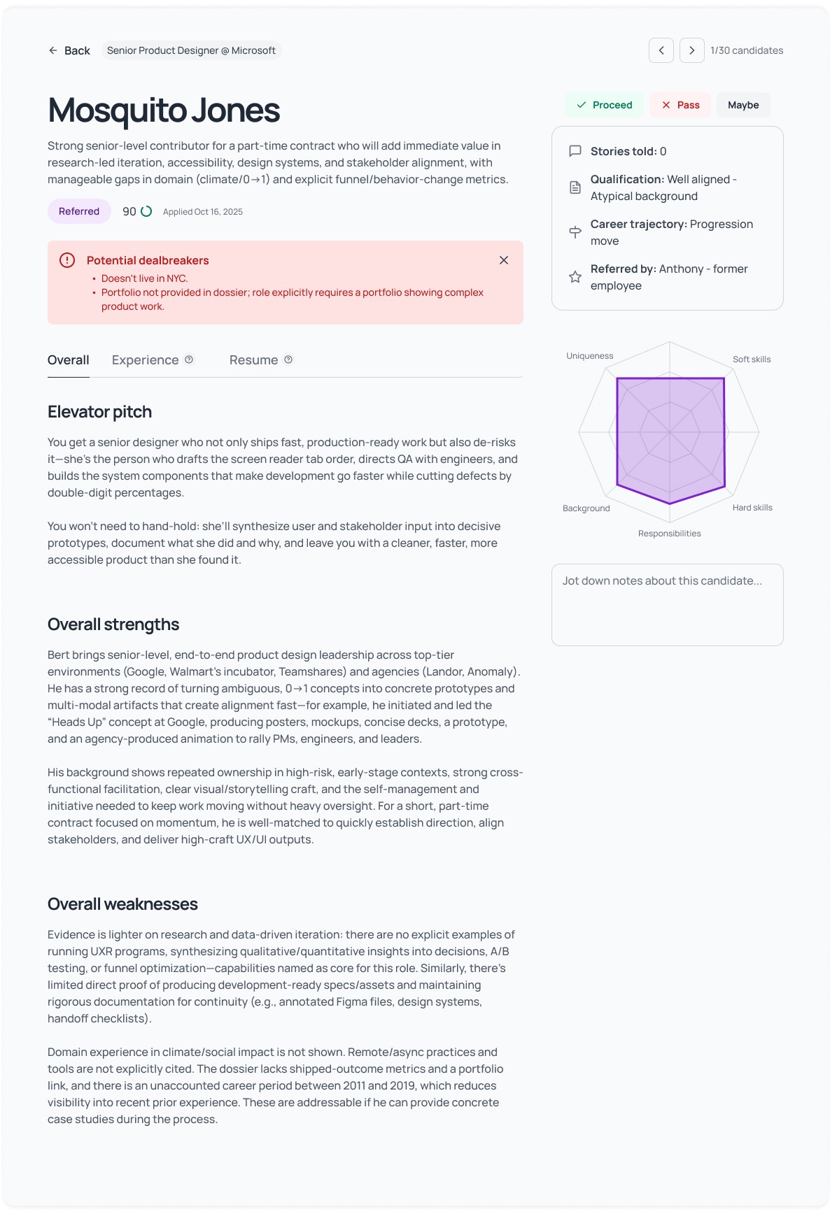 AI synthesizes their experience into what you need to know—no resume scanning required.